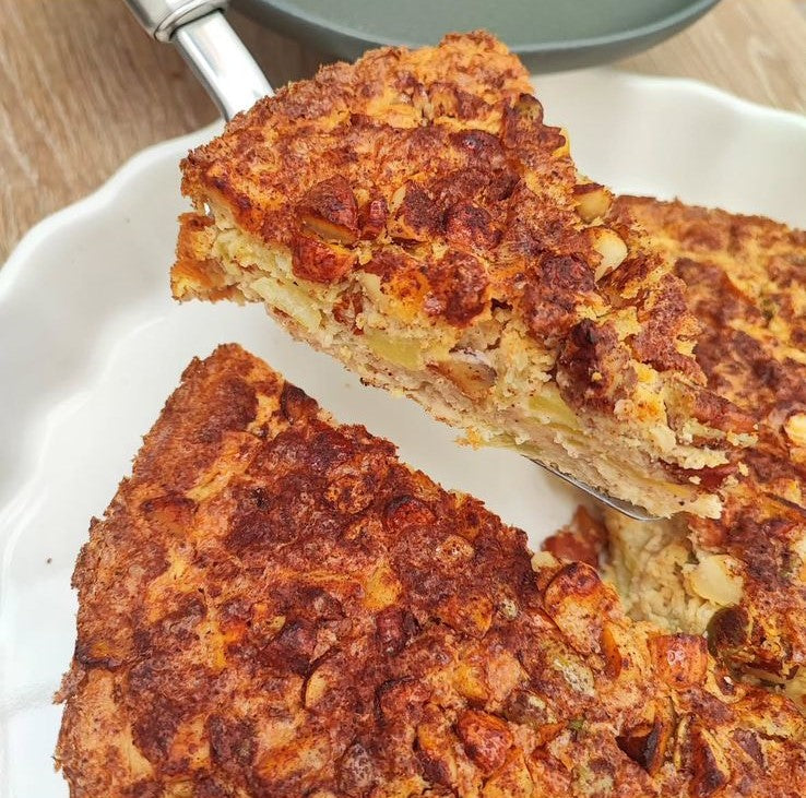 Torta de manzana con nueces pecanas, nueces del brasil y semillas de calabaza, sin azucares añadidos, sin glúten, endulzada con extracto de stevia.